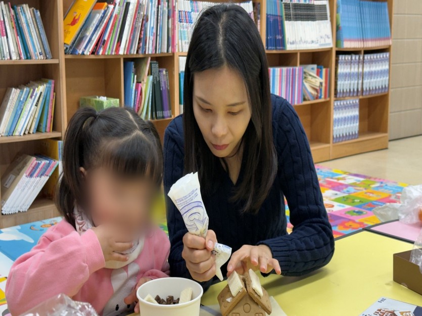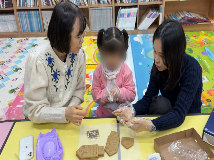 각자 과자를 붙이고 장식을 얹어 작은 집을 완성해 가는 과정 속에서, 아이들은 서로 응원하며